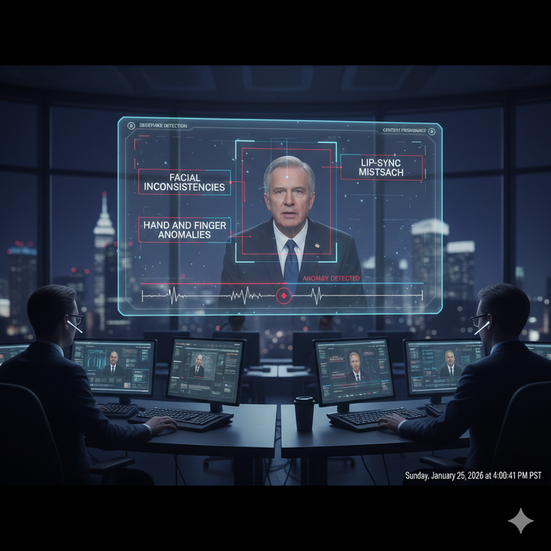 - Manual Visual Scan: Check for facial inconsistencies, lip-sync mismatch, and hand/finger anomalies.
